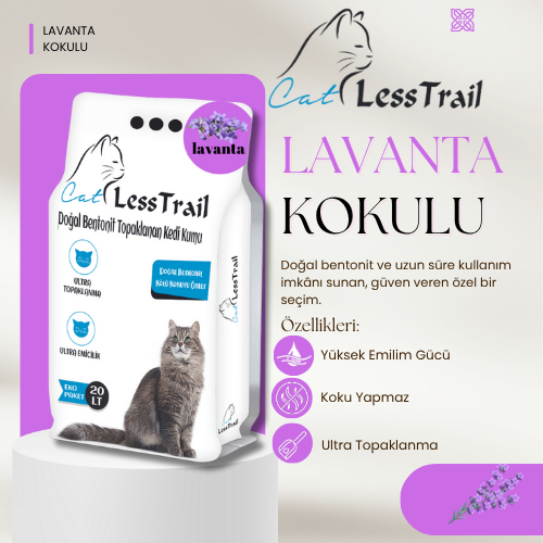 LESS Trail 20 Lt İnce Tane Lavanta Kokulu Beyaz Bentonit Kedi Kumu, kedinizin tuvalet alanında hijyen ve rahatlatıcı bir koku sağlar. İnce taneli yapısı, sıvıyı hızla emerek sağlam topaklar oluşturur ve temizlik işlemini kolaylaştırır.