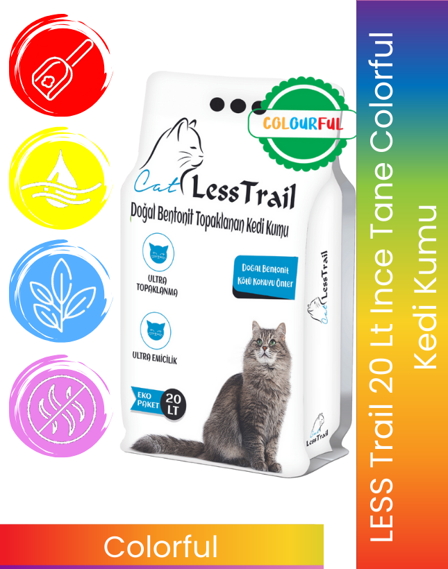 Ürün Adı: Less Trail Colourful 20 Lt Bentonit Kedi Kumu Hacim: 20 litre İçerik: Doğal bentonit Özellikler: Renkli granüller, güçlü topaklanma, yüksek emicilik, düşük toz oranı