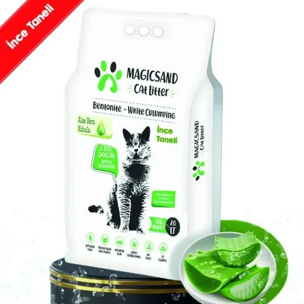 Ürün Adı: Magicsand Cat Litter Aloe Vera Kokulu Kedi Kumu – 20 Lt (İnce Taneli) Formül: Doğal bentonit + yatıştırıcı aloe vera esansı Yapı: İnce taneli Koku: Ferah ve hafif aloe vera aroması Topaklanma: Hızlı, sağlam ve kolay temizlenebilir topaklar Tozluluk: Düşük toz seviyesi Ambalaj: 20 litrelik ekonomik paket