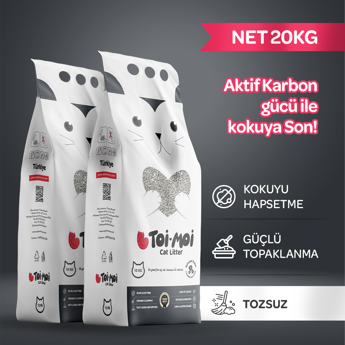 Toi Moi, sadece tozsuz olmakla kalmaz; aynı zamanda hızlı topaklanır, kötü kokuları etkin bir şekilde hapseder, patilere ve tüylere yapışmaz ve uzun süreli bir kullanım imkânı sağlar. Kimyasal içermeyen, doğayı koruyan ve ekolojik bir seçim olan Toi Moi aktif karbon kedi kumunu güvenle tercih edebilirsiniz.