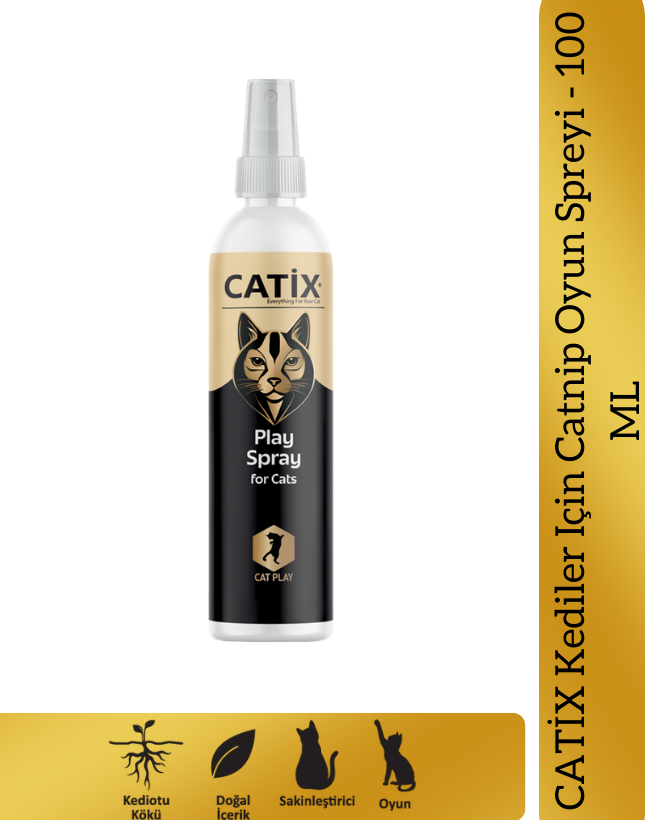Catix Spray kedilerde davranış değişikliğine sebep olan nepetalakton aktif organik bileşiğini içeren catnip yağı ve Kedi otu kökü (Valerian root) içermektedir.