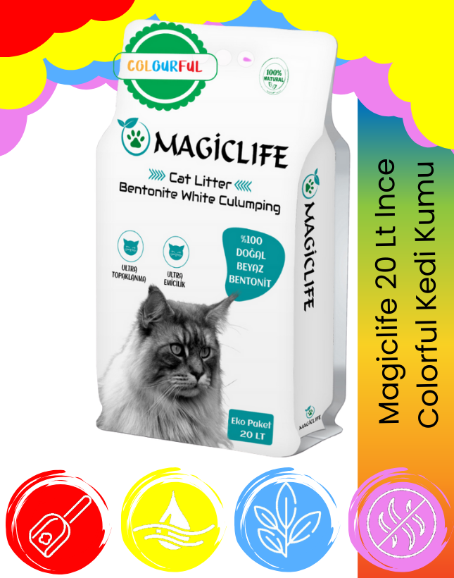 Ürün İçerisinde Renkli Taneli Bentonit Parçaları Bulunmakta Olup Yüksek Koku Hapsetme Ve Topaklanma Sağlamaktadır *Kedi kumu içeriğinde tamamen doğal bentonit kullanılması sebebiyle sizin ve kedinizin sağlığına zarar verecek herhangi bir kimyasal bulunmamaktadır. Emicilik Özelliği: kedi kumu, mükemmel topaklaşma etkisiyle sıvıyı içine çeker ve anında topaklaşır. Bu özelliği ile size ve kedinize zarar verebilecek her türlü bakterinin üremesinin önüne geçilmiş olur. Minimum Tozlanma: kedi kumu üretilirken tüketicinin kullandığı ortamda tozlanma meydana gelmemesi için özel işlemlerden geçirilerek toz miktarı minimum düzeye indirgenmiştir. Koku Önleyici Etkisi: kedi kumu çevreye kötü kokuların yayılmasını önlemesinin yanı sıra, sıvı ile temas etmesi durumunda bulunulan ortama hoş bir koku verir. ;