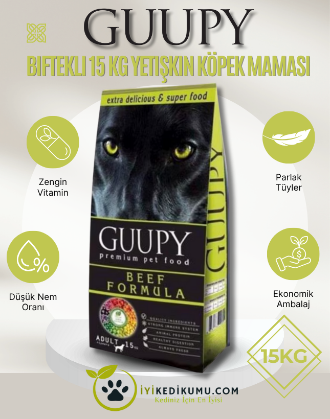 Guupy Dog Biftekli 15 kg Yetişkin Köpek Maması, yetişkin köpeklerin beslenme ihtiyaçlarına uygun olarak formüle edilmiş, yüksek proteinli ve lezzetli bir kuru mamadır. İşte ürünün detaylı açıklaması:
